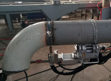 性能特点:适用于长输管道或安装现场的固定焊缝填充盖面焊接;碳钢管道焊接时无需轨道,磁轮吸附在管子上自动爬行;小车旋转速度无级调速;焊枪可沿管子轴向进行线性摆动;焊枪可沿管子轴向进行角度调节;焊枪可垂直于管子轴向进行角度调节;焊枪可沿管子径向进行上下距离调节;标配HiArc M500A焊接电源;实芯焊丝+混合气体向下焊焊接,药芯焊丝+混合气体向上焊焊接。